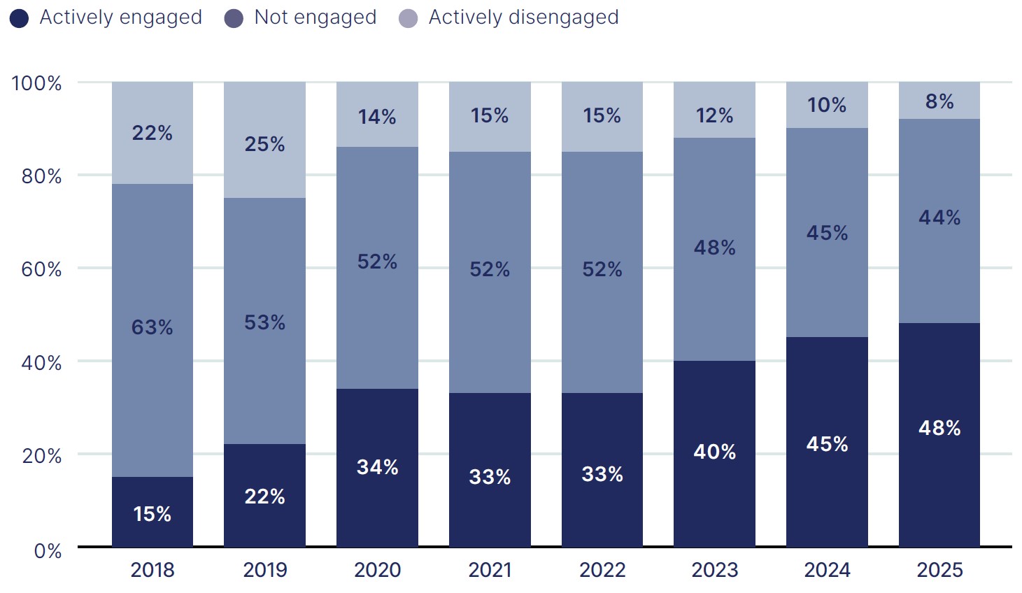 Actively engaged employees accounted for 48% of respondents, up from 45% in 2024. Actively disengaged employees decreased to 8%, 2% lower than 2024 – providing further encouragement that engagement is improving across our workforce.